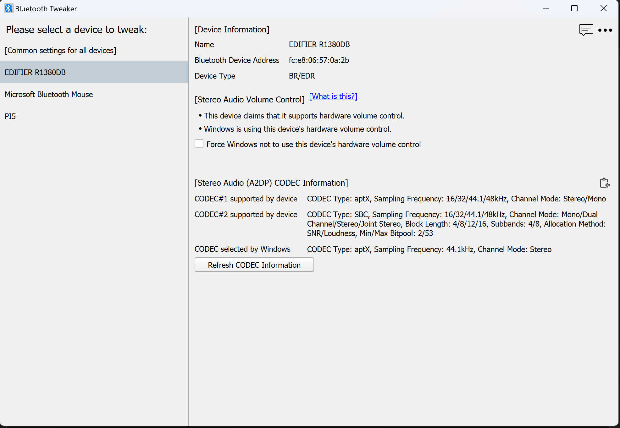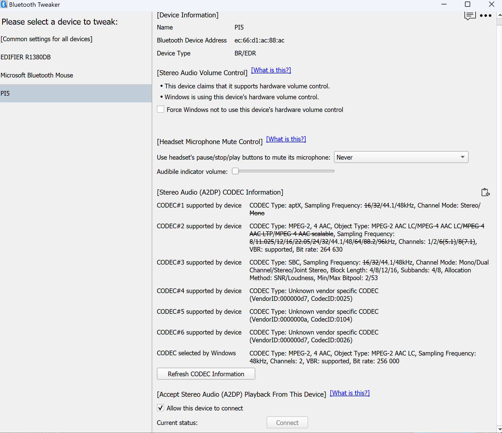 Hallo, ich habe die Edifiert 1380DB Lautsprecher mit Bluetooth und APTx Fähigkeit und wollte fragen, ob es mit meinem Ideapad 5 Pro (7840HS) über Bluetooth per APTx verbunden ist und wie ich es feststellen kann mit welchem Codec sie gerade kommunizieren? Habe WIndows 11. Lg