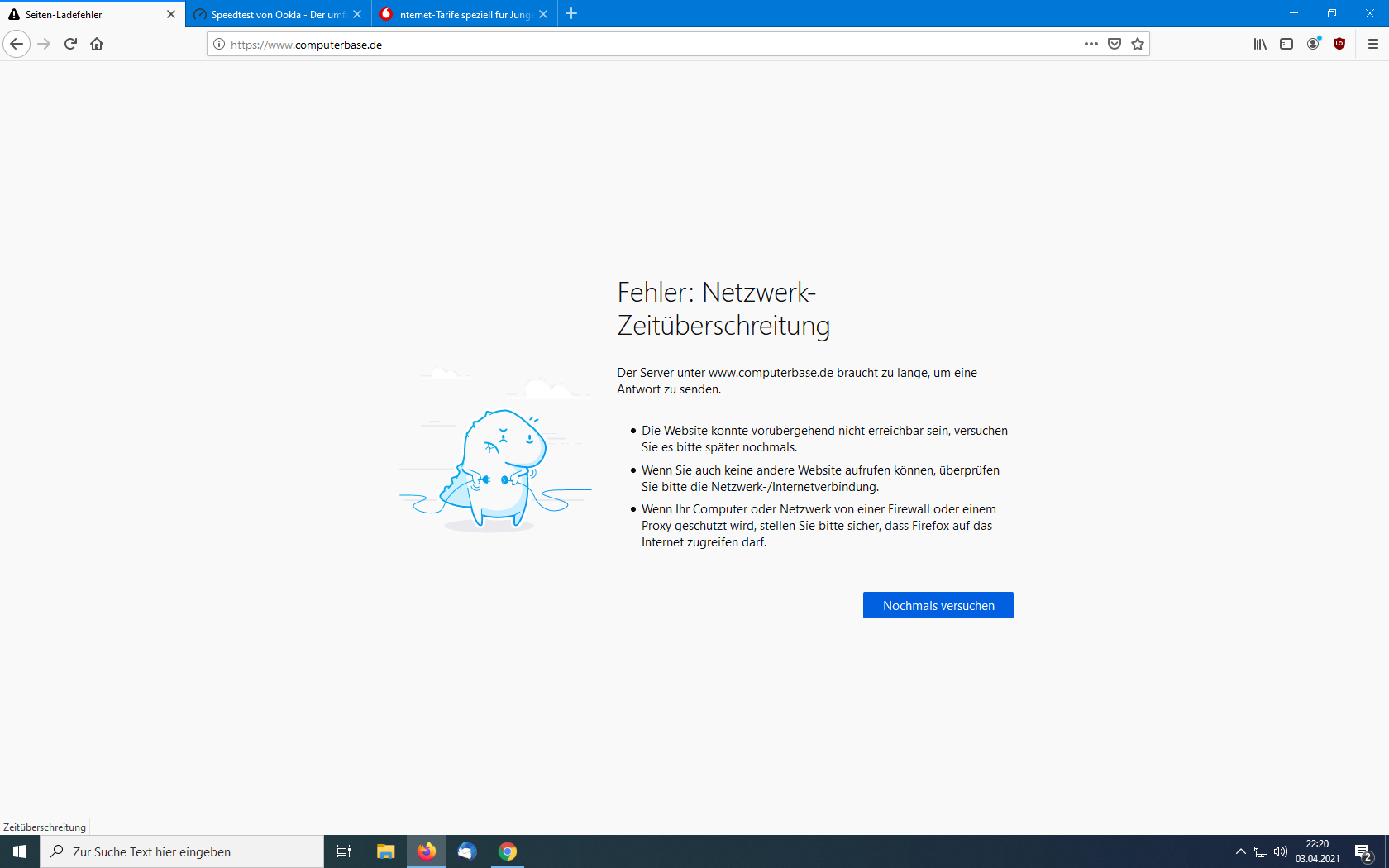 Seit 2 Tagen ist mir aufgefallen, dass die 250 Tausender Leitung nicht so gut funktioniert. Ich bekomme des öfteren immer die Fehlermeldung wie im Bild zu sehen. Manche Seiten können von Chrome aufgerufen werden. Manche von Firefox nicht. Nach dem Neustart des Ccomputers läuft das Internet kurz schneller und dann wird es langsamer. Ich habe mir überlegt den Router kurz auszumachen und dann neu zu starten. Aber da meine Bekannten Ihre Vertragsdaten hat, traue ich mir das nicht zu, weil wenn das Internet dann komplett ausgehen würde, ich dann ein Problem hätte.