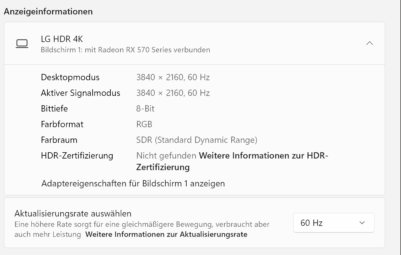 HDR ist im Windows-Betrieb inaktiv geschaltet. Ebenso das 10Bit Pixelformat; welches wiederum auf 8Bit begrenzt worden ist.