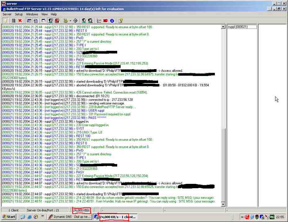 Gestern ist mir aufgefallen, das bei meinem FTP Server mit 24 kb/s gezogen werden kann. Ich hab ne ganz normale T-DSL 768/128 Flat. Der User der saugt ebenfalls.