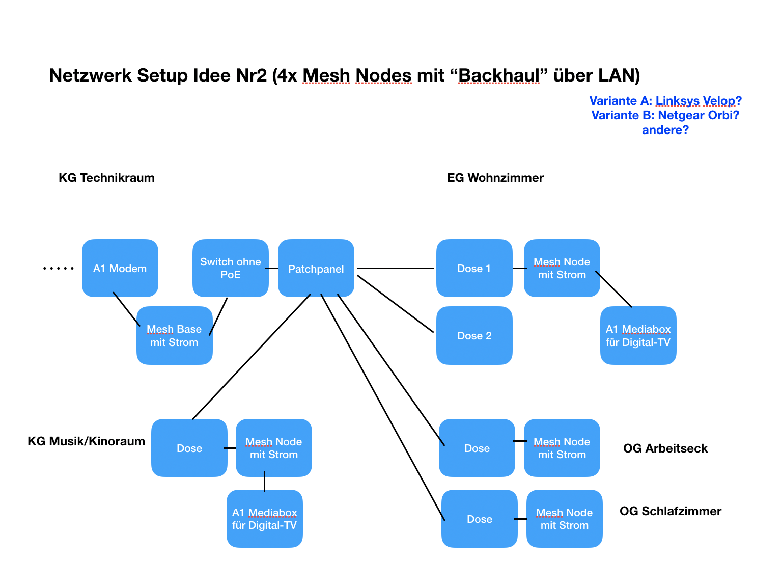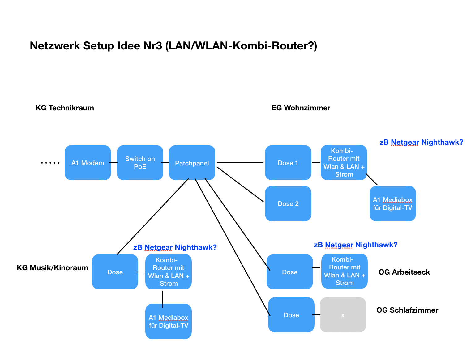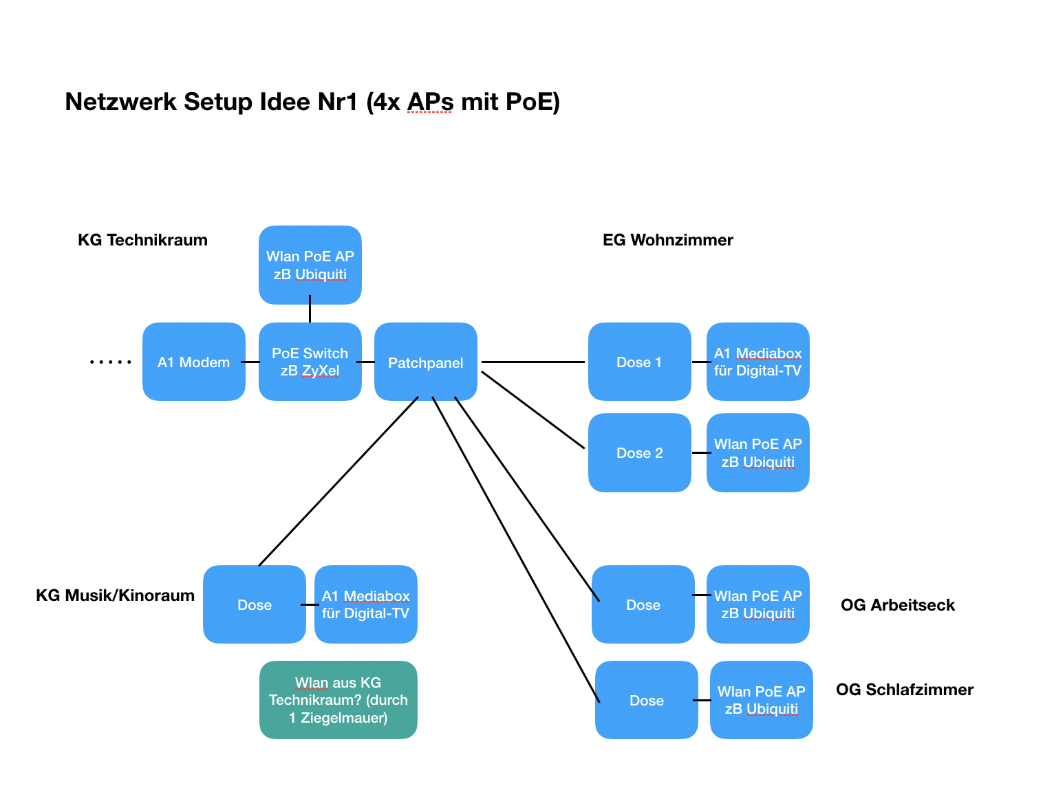 - Elektriker hat bereits Netzwerkleitungen (Cat 6) an 3 Punkte im OG, 1 Hauptpunkt im EG Wohnzimmer + 2 Punkte im KG vom Technikraum gezogen, wo sich u.a. der Netzwerkschrank/Patchpanel befinden wird und wo die Telefonleitung reinkommt... leider nur Single-Leitung pro Netzwerkdose verlegt, wie sich jetzt herausgestellt hat :-(