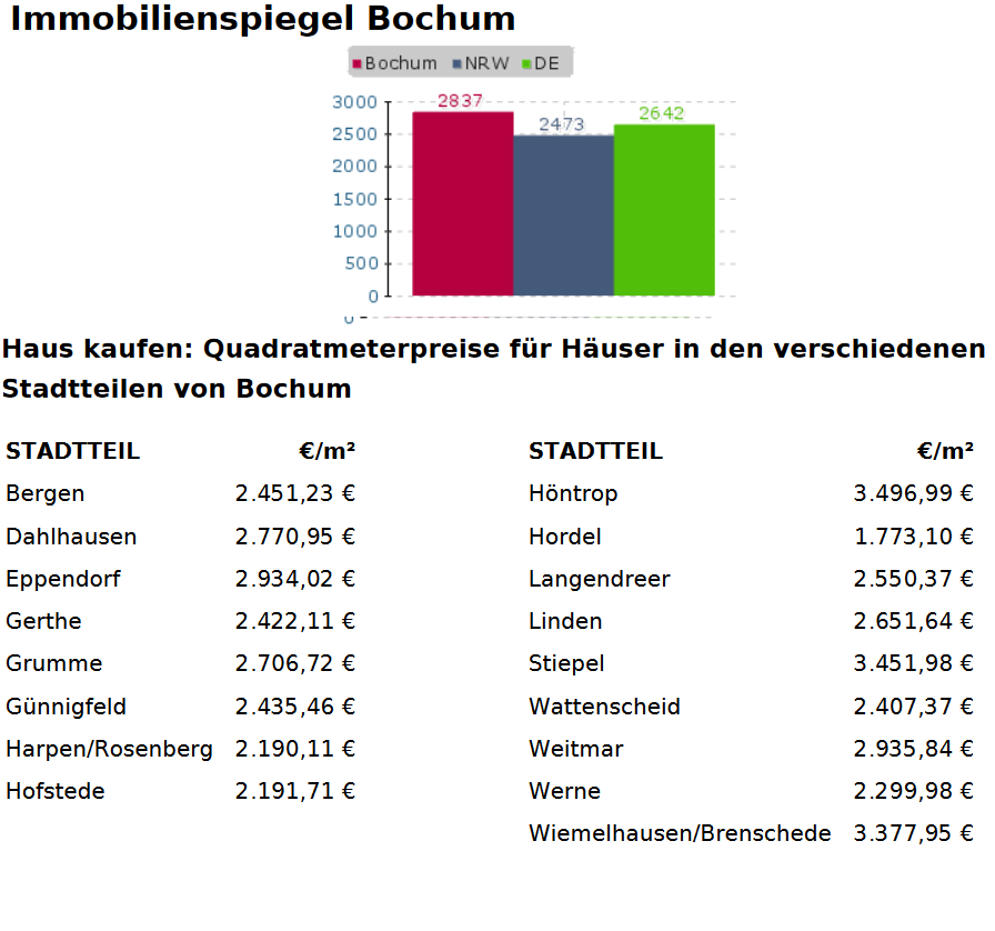 Wir haben 2014 gekauft, wo die Preise im Schnitt bei 2200€ den m² lagen, jetzt sind es etwas über 3000€. Wobei wir mit Wiemelhausen offenbar einen Stadtteil erwischt haben, der was teurer ist. Das war mir bis gerade nicht mal bewusst. Bei uns gilt Stiepel als Stadtteil, in dem nur die Reichen wohnen (gern auch Königreich Stiepel genannt), deswegen versteh ich die aktuellen Preise für Wiemelhausen auch nicht ganz, wobei das sicherlich primär an Brenschede liegt, das an Stiepel grenzt.