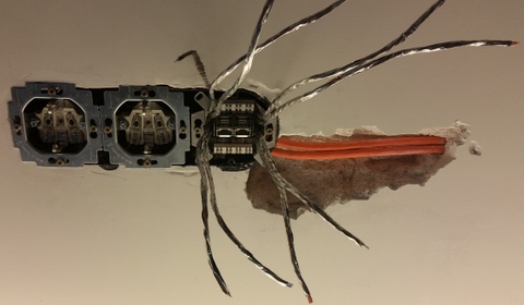 Verlegekabel ist ist jetzt fast überall verlegt. Die Dosen (Busch-Jaeger 0218/12-101 UAE-Anschlussdosen- sehr gutes und leichtes Arbeiten - Preis ist angemessen) sind angeschlossen und befestigt.