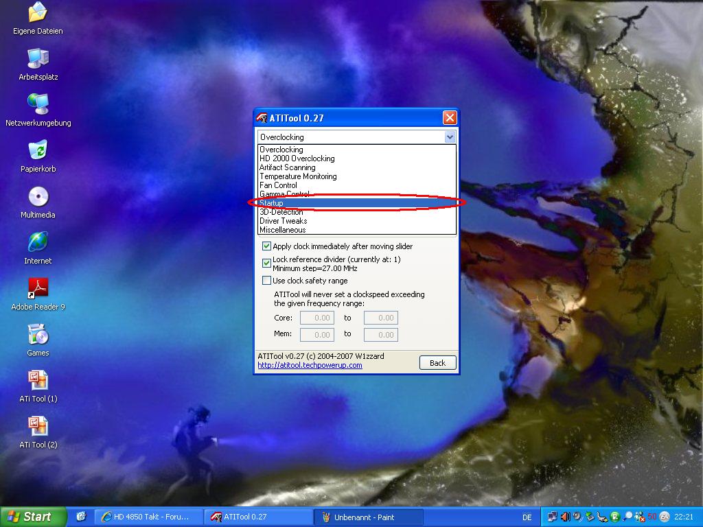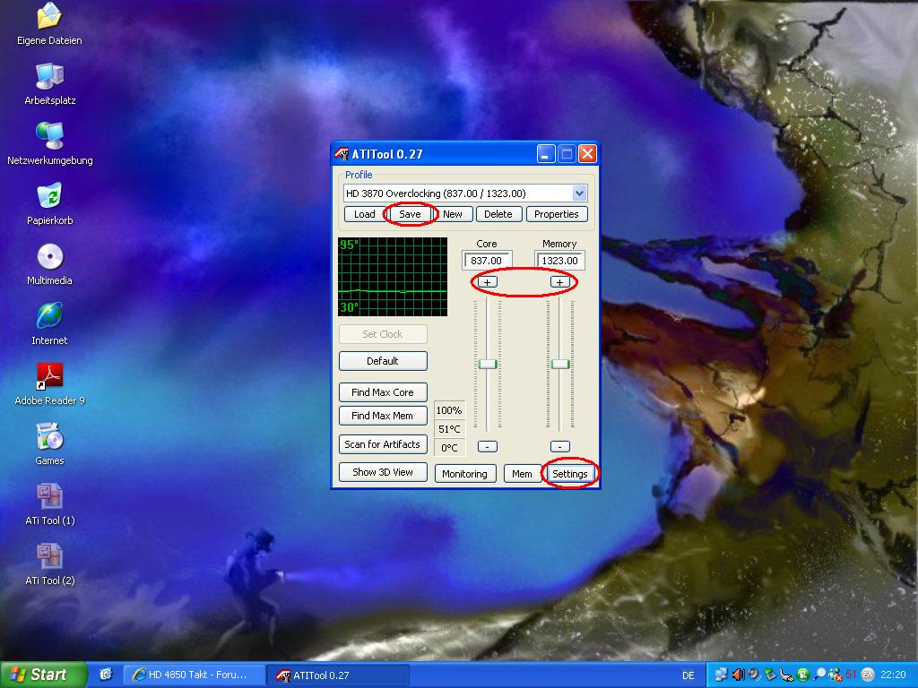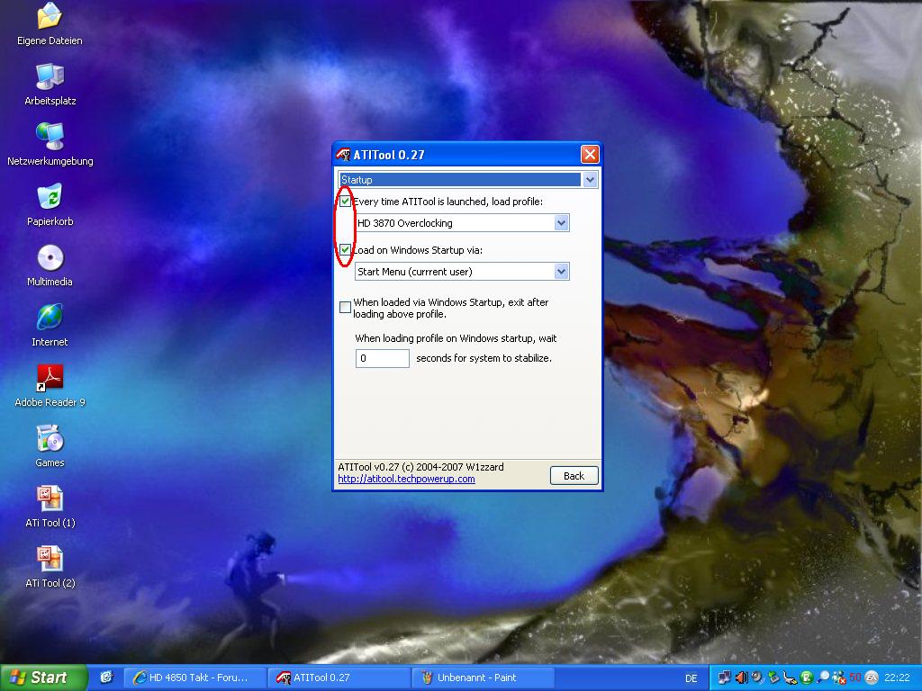 1. die Taktraten über die Pluszeichen anheben -> 2. das Profil absichern -> 3. Auf Settings klicken -> 4. Auf Startup klicken -> 5. bei den beiden oberen Kästchen ein Haken setzen