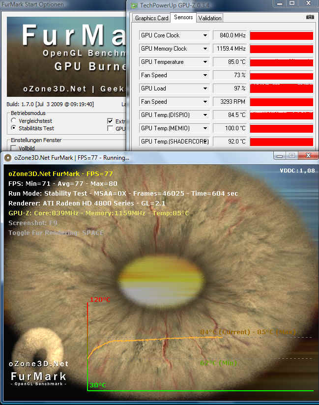 Laut den Werten auf dem Bild im Anhang hat meine Karte also mit nur 1,083V und übertaktet auf etwa 840\1160 MHz tatsächlich den Furmark Extreme 10 Minuten lang "ertragen".