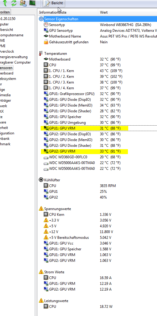 . Ich kann mit meiner G15 über everest die Temps während dem spielen auslesen. Bei Crysis 2, welches ich heute angespielt habe, kommen starke Grafikfehler sobald die VRM Temperaturen über ca. 90 Grad gehen. Darunter ist alles in Ordnung. In anderen Spielen wie BFBC2 oder Starcraft 2 habe ich dieses Problem nicht, allerdings werden die Temperaturen dort auch nicht so hoch. Die GPU-Temp liegt immer bei ca. 60 Grad und Taktraten sind Standart. Als Kühler habe ich mir damals zusätzlich den Accelero Extreme besorgt und damit war sie auch deutlich kühler wie vorher. Dieser läuft bei mir (da ich so oder so ein Headset aufhabe) immer auf 100%.
