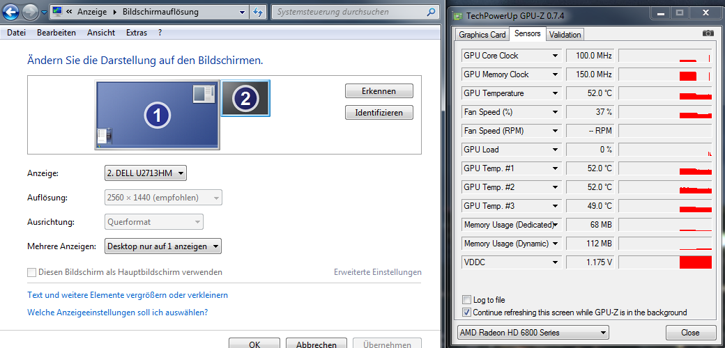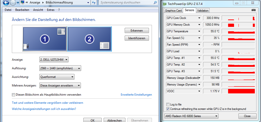 Zwei Monitore, man achtte auf GPU und Memory Takt