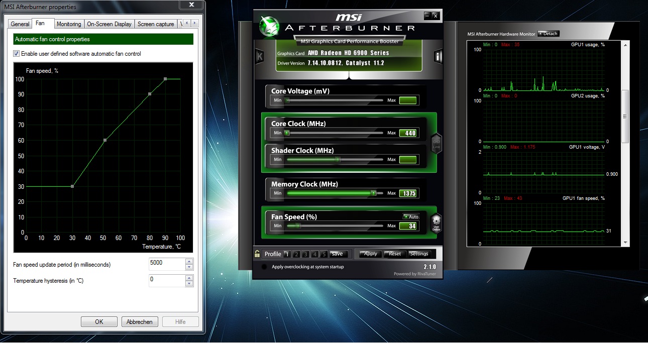 Ich habe nun auch Automatische Profile drin. Wenn ich eine 3d anwendung starte, wird Profil 2 Aktiviert, was die GPU auf 880/1375MHz + eingestelle Luftsteuerung bringt und wenn ich die 3D Anwendung wieder beende, wird Profil 1, was einen takt von 250/150MHz beinhaltet aktiviert. So muss ich mich nicht mehr um die Kühlung kümmern.