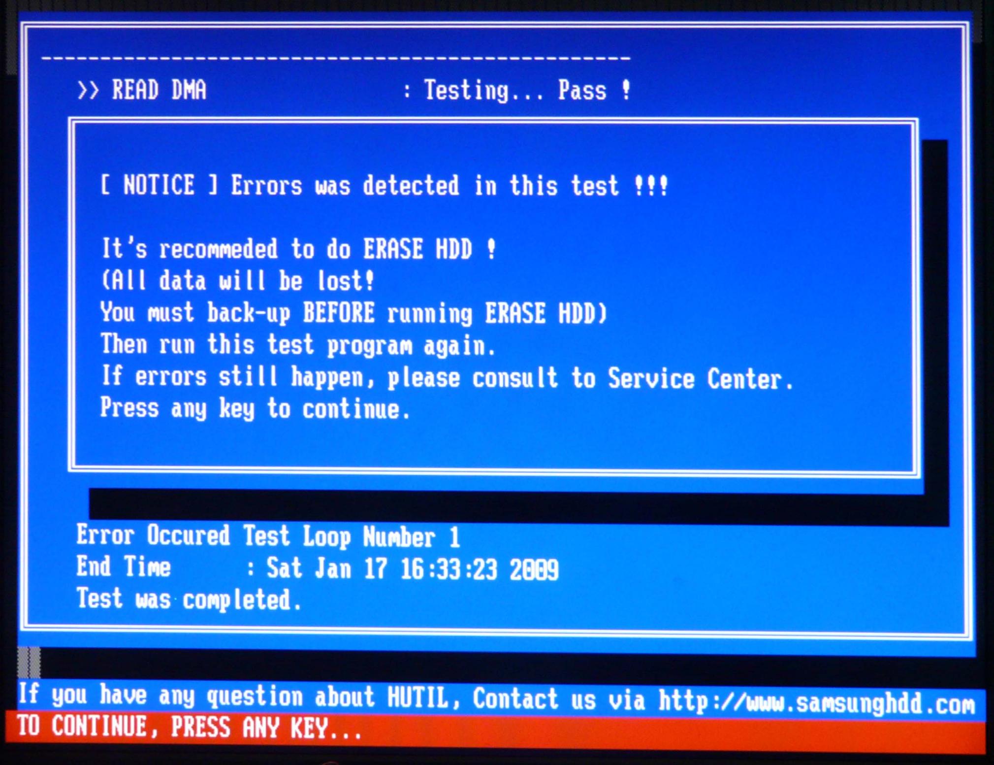 Da es ein Samsung Drive ist und die Firma hat mit HUTIL ein Testvehikel, liess ich auch die laufen, hier schien er alle Tests zu passieren ausser einen ECC Error unter C:4732; H:1; S:128. Die Frage ist kann diese Sektor für den Problem verantwortlich sein, kann man sie isolieren oder muss ich die ganze Disk löschen und neu beschreiben?