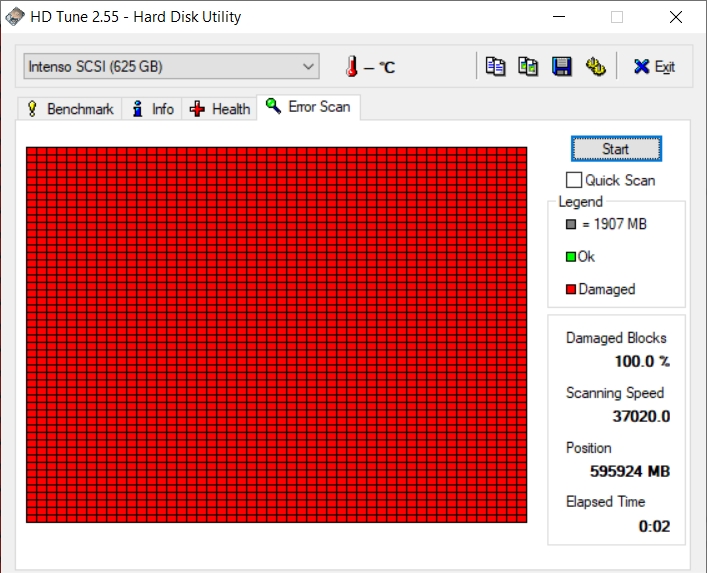 ich habe eine externe 3,5" Festplatte. Diese funktioniert einwandfei. Möchte diese nun als Backup nutzen und nach Formatierung einen Error Scan mit HD Tune machen. Sobald ich diesen Starte (Egal ob Quick Scan oder normal) werden alle Blöcke rot / demaged angezeigt innerhalb von 2 Sekunden.
