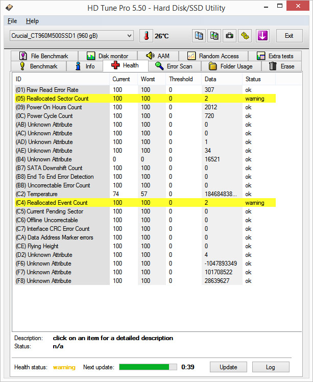 HD Tune zeigt bei Crucial M500 "(05) Reallocated Sector Count" Warnung