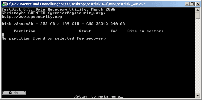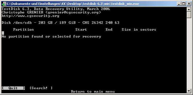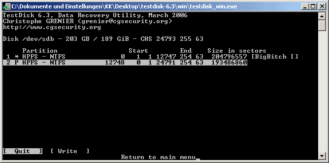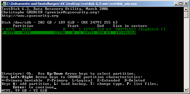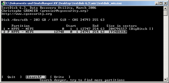 Achja, wenn ich die zweite Partition markiere und auf Enter klopfe um die "Search!" Funktion durchzuführen, wird seltsamerweise trotzdem die erste Partition (BigBitch I) gescannt. oO