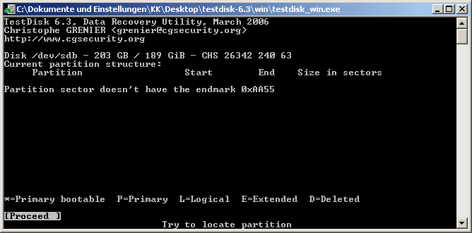 Dummerweise bekomme ich, wenn ich bei der zweiten Partition (Bigbitch II) auf p drücke eine Fehlermeldung (siehe Attachment).