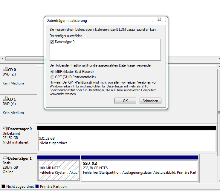 Auf beiden Platten habe ich ganz normale MBR Partitionen und auf der einen liegen ein paar (unwichtige) Daten.