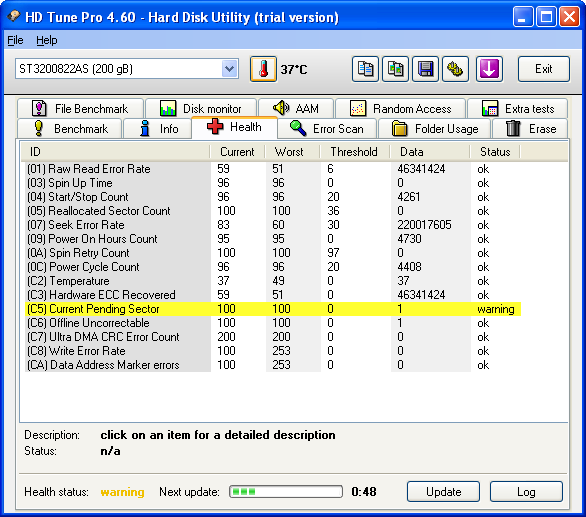 ich habe ein Problem mit meiner einzigen 5 Jahre alten Seagate Baracuda 7200.7 200GB S-ATA Festplatte. Sie macht seit der letzten Zeit nur noch Probleme. Ich habe seit etwa 1 Monat immer mal Treiber-Aussetzer, es kommt von Windows eine Meldung; der Treiber sei nicht installiert, dann beim Neustart ist er da. Ich will ein Spiel spielen, das angeblich nicht existiert, noch ein Versuch es existiert doch! Und heute hat sich mein System schon das 7. Mal aufgehängt. Ich habe gesurft oder gezockt und aufeinmal freezt das Bild, kein Blue-Screen kein Ton, garnichts geht mehr. Nicht mal den Computer kann ich mehr ausschalten, das geht nur noch über den Start-Knopf. Gerade habe ich MAFIA II installieren wollen; ich habe es jetzt zum 3. Mal versucht und jetzt hat es endlich geklappt, davor ist das Bild während der Installation wieder gefreezt.