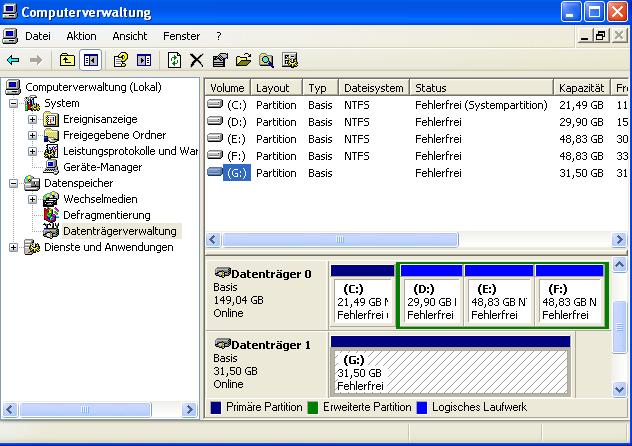 - Unter Systemsteuerung/Verwaltung/Computerverwaltung/Datenträgerverwaltung wird die Platte als online und fehlerfrei angezeigt, jedoch wird kein Dateisystem angezeigt.