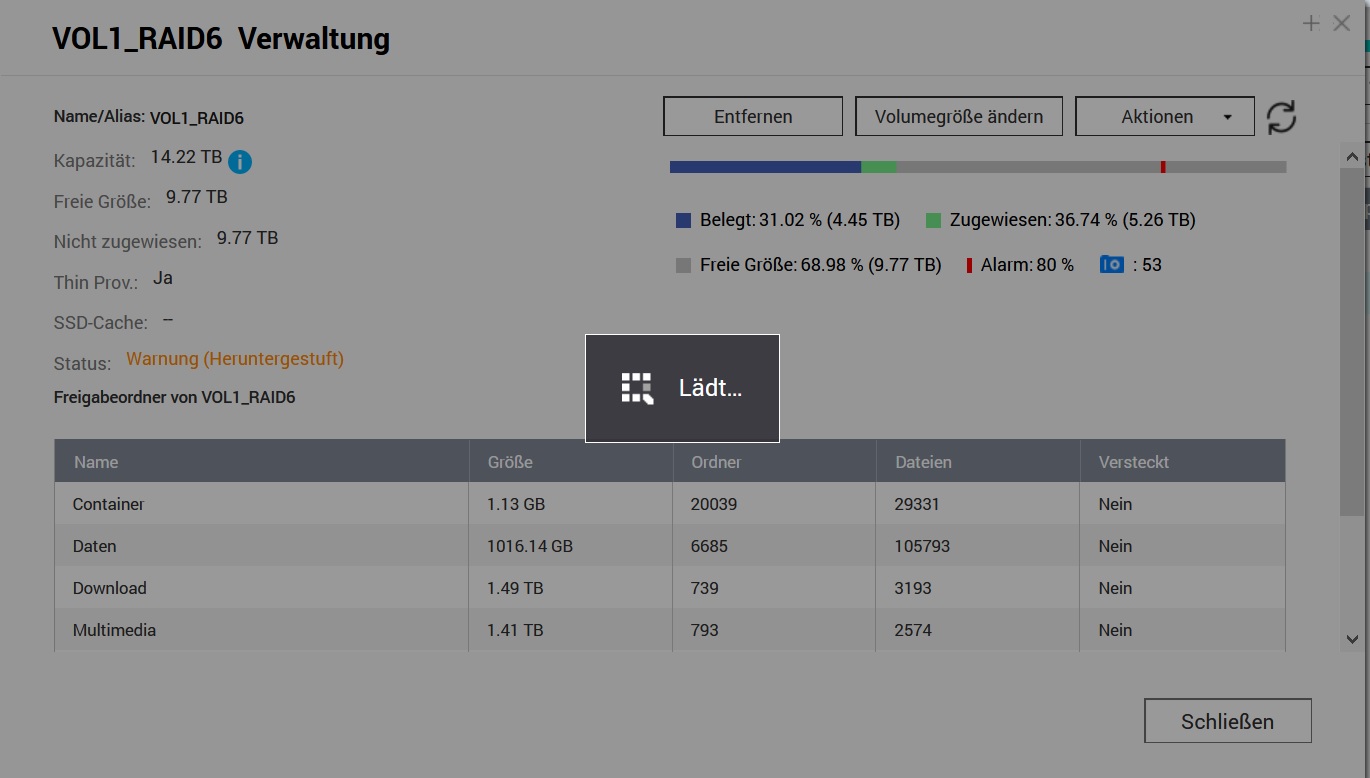 Das RAID Volume ist relativ leer siehe Screenshot. Im Speichermanager wird eine HDD, die im Verbund ist als "leer" angezeigt.