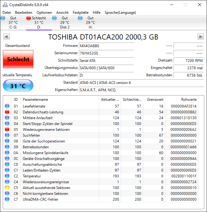 Seit geraumer Zeit macht meine HDD Toshiba DT01ACA200 2TB enorme Probleme.