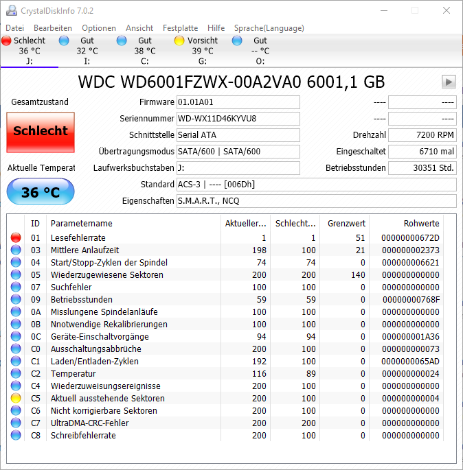 Die Platte hat noch Garantie. Mit den Data Lifeguard Diagnostic für Windows einen extended SMART selftest durchführen. Der dürfte fehlerhaft sein. Wenn nicht trotzdem RMA machen. Da brauchen die sich gar nicht rausreden, bei den Screenshots und dem Verhalten. Außerdem ist ja ganz klar zu sehen, dass der Grenzwert bei 01 unterschritten wurde. Da ist für mich jegliche Diskussion überflüssig. Da hat sich gar nichts geheilt. Gut, dass du deine Daten noch in Sicherheit gebracht hast. Und natürlich wirst du sehr bald auch mit Backups anfangen, um noch Schlimmerem vorzubeugen