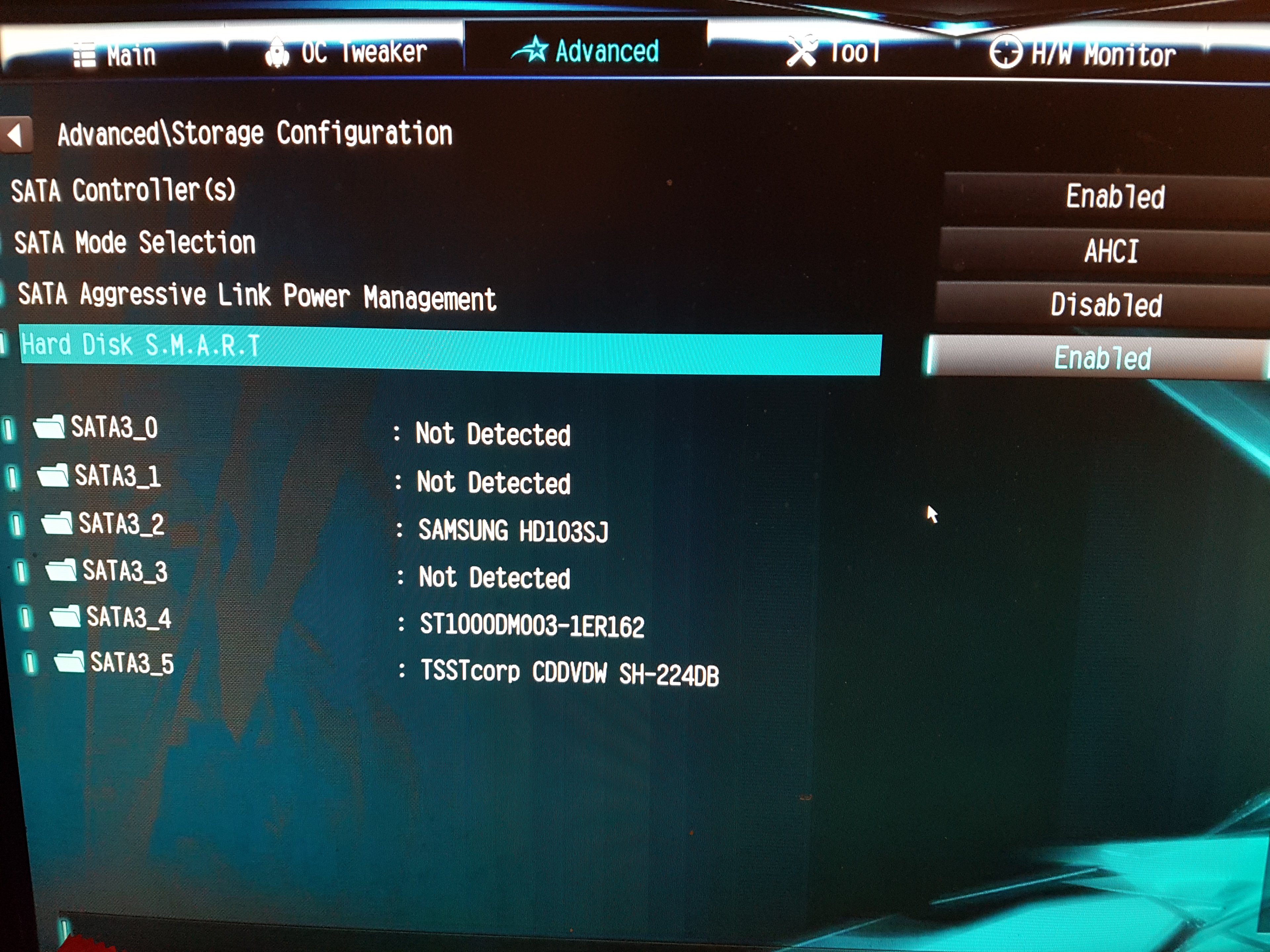Wenn es eine Samsung HD103SJ ist, dann lies dies hier und machen ggf. ein FW Update, denn bei denen gibt es einen FW Bug der dazu führt das sie an SATA 6Gb/s Host Controller nicht erkannt werden und sich sogar ggf. selbst zerstören.