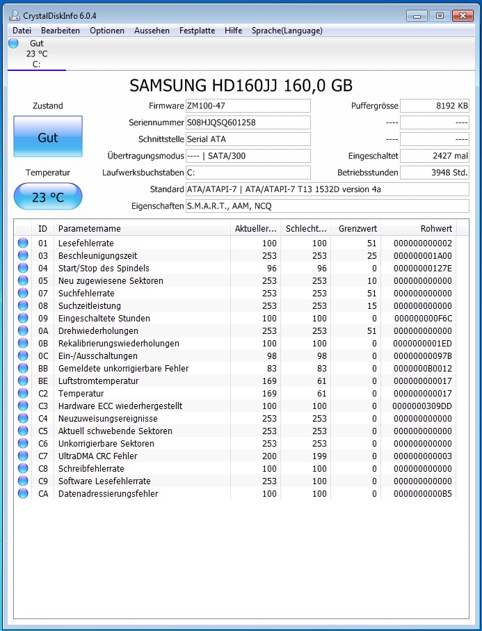 Allerdings zeigt CrystalDiskInfo keinen "Defekt" an.