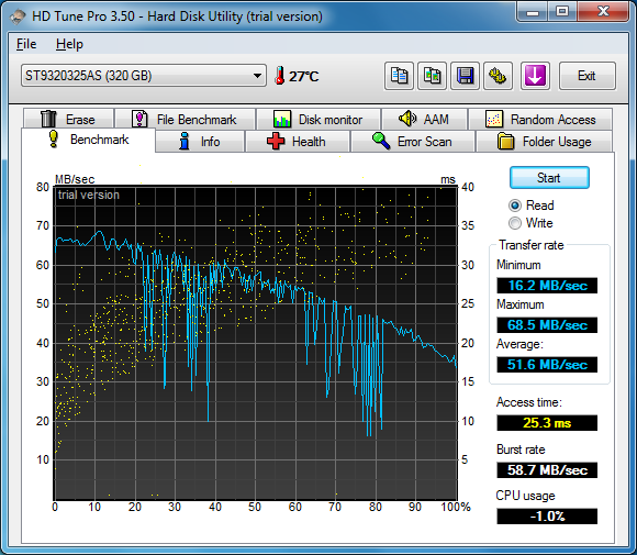 Da mir, dass etwas schleierhaft kam, habe ich die HDD mit HDTune getestet.
