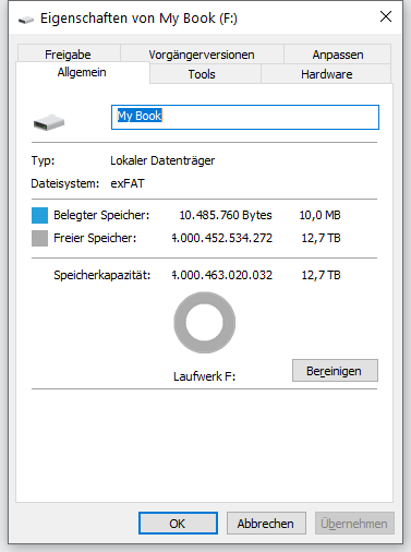 Und das es unter Bereinigen leer ist liegt an exFAT, in meinem Bild nutzt das Laufwerk NTFS.