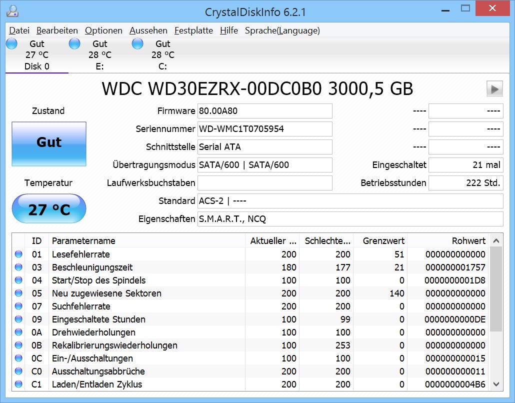 Mit CrystalDiskInfo wird die platte auch erkannt und als Gut befunden.