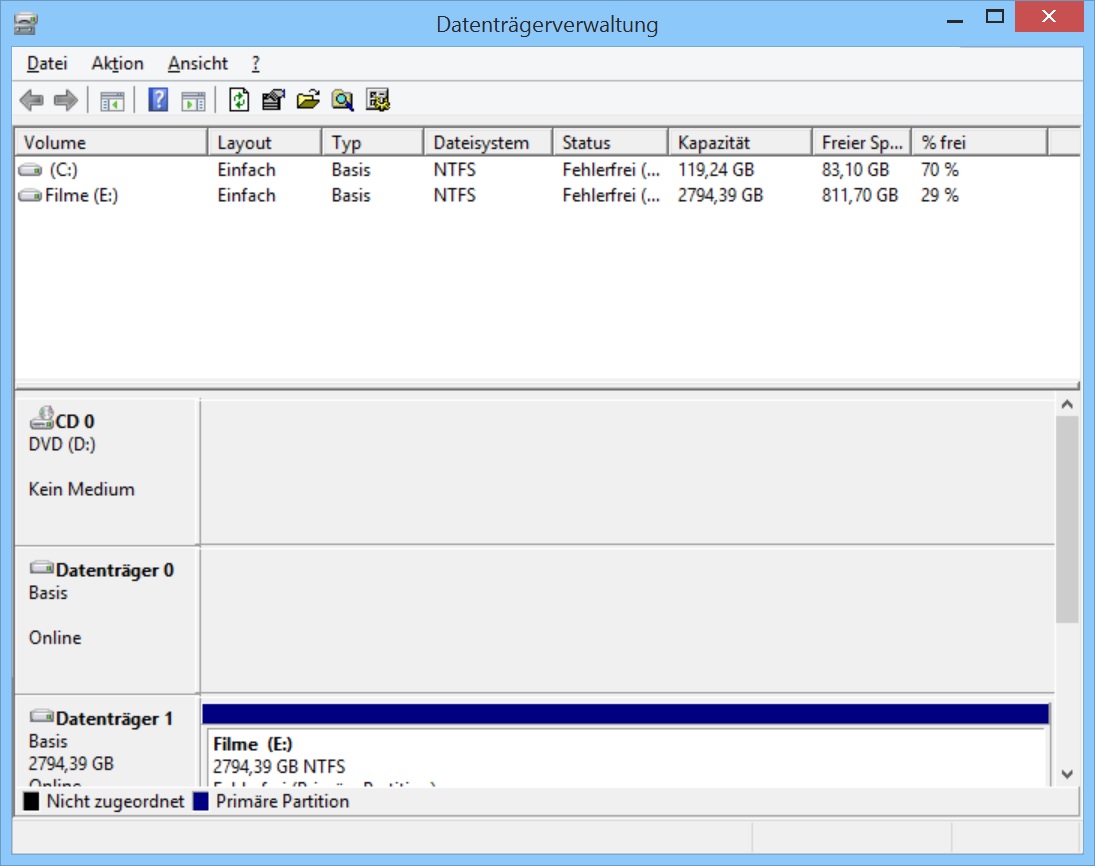 Über die Datenträgerverwaltung habe ich das ganze angeschaut und bemerkt das nicht alle 3TG verwendet werden. Also habe ich das Volumen F gelöscht. Problem ist jetzt nur, das ich kein neues Volumen herstellen kann die festplatte wird noch erkannt aber ich kann sie nicht formatieren oder sonst was.