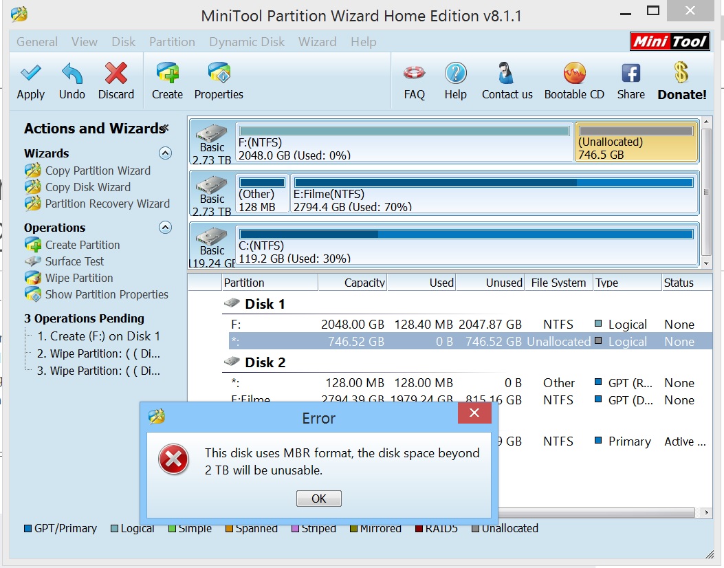 gpt funktioniert eigentlich nur mit max. 2tb, mit mehr kann es nicht umgehen. gute frage wie du das mit der anderen 3tb platte hinbekommen hast. kannst du auch ohne probleme mehr als 2tb darauf beschreiben? bist ja im moment noch etwas darunter...