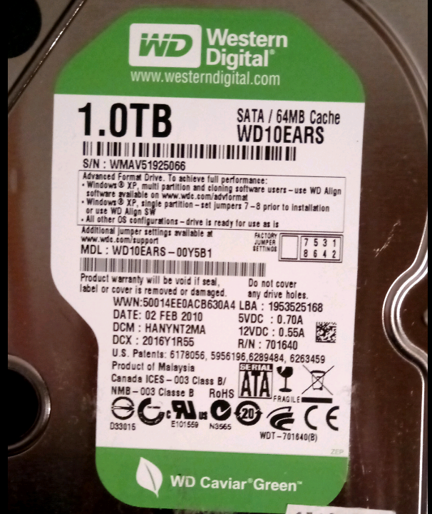 Aktuelles Festplatten Modell: WDC WD10EARS-00Y5B1 1000,2 GB. 3,5 Zoll