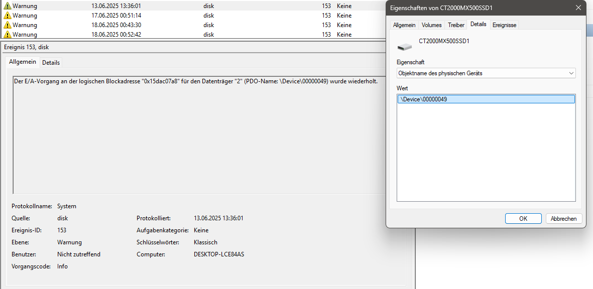 Betreffen alle diese "disk"-Fehler (und andere) nur die MX500? Keine Fehler zur HDD?