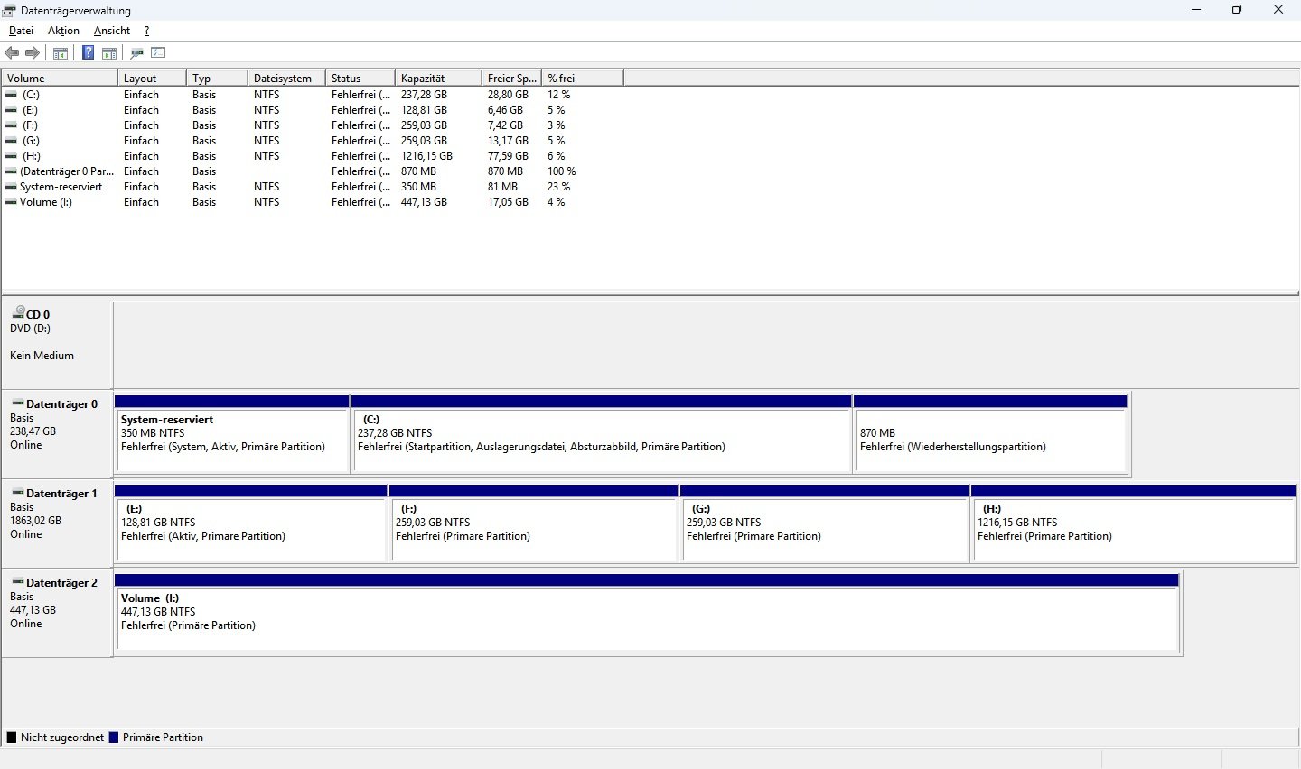 Es handelt sich um eine 2TB 3,5" HDD von WD genauer weiß ich es nimmer, blau und flott damals, die unter Windows 11 die Laufwerke (eher Partitionen) E:, F:, G: und H: stellt.