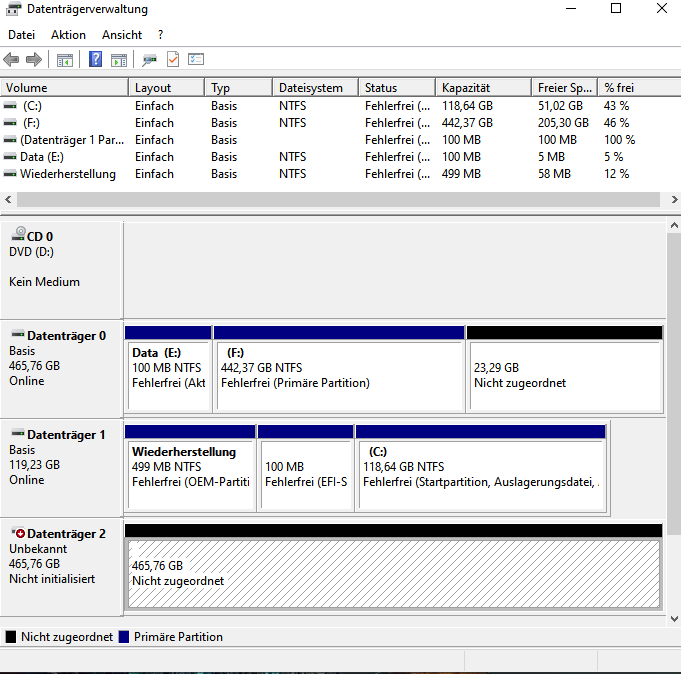 Es erscheint auch kein Fenster mit der Laufwerksbuchstaben Zuweisung, die Platte wird nur als Datenträger 2 (Unbekannt, nicht initialisiert) angezeigt.