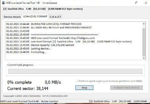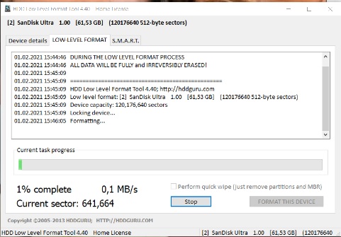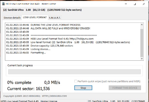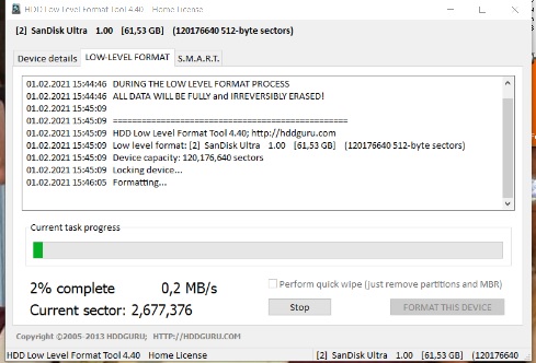 ich nehme das Low Level Format Tool, 1. weil sich der Fortschritt bei normalem Formatieren mit schnellformatieren nicht änderte.