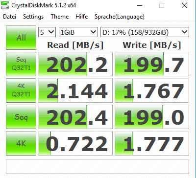 ich habe eine 850 Evo 120 GB als Systemlaufwerk, auf dem noch knapp 80 GB frei sind, und eine 1 TB Seagate ST1000DM003 Festplatte für Spiele und Dateien. 660 GB frei. Gestern habe ich eine 1,1 GB große Gameplayaufnahme von einem Stick auf die SSD kopiert. Das dauerte recht lange und nur mit ~15 MB/s. Danach wollte ich einfach gucken wie lange der Kopiervorgang auf die HDD dauert. Das waren weniger als 5 Sekunden bei bis zu ~370 MB/s
