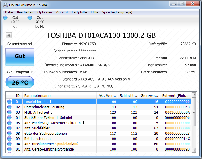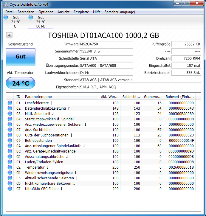 ich habe mir nun auch eine SSD zugelegt. 120Gb um halt mein System schneller zu haben und Spiele usw auf die 2.te HDD. Jedoch ist mir aufgefallen, dass meine HDD nun sehr laut ist. Selbst bei nicht-Belastung ist sie sehr laut und auch vorher war sie nicht so laut, als sie noch als Hauptplatte lief. Sie hat sonst alles so wie vorher. Den Platz hab ich bereits schon einmal geändert, um zu testen, ob es am Gehäuse liegt. Liegt es aber nicht. Die HDD ist noch ganz neu, erst einen halben Monat in Nutzung. Sie kommt von Toshiba, hat SATA-3 (6GB/s) und hat 1Tb.