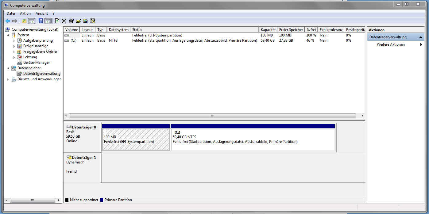 In der Datenträgerverwaltung wird sie nun als dynamischer Datenträger angezeigt mit der Bezeichnung fremd.