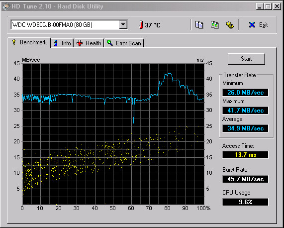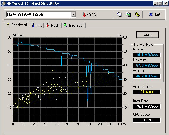 Der Einbruch auf 10MB/s ist schon erschreckend. Hast du noch andere Programme im Hintergrund laufen gehabt, die auf die HD zugreifen? Auch der Accesswert von 21ms ist langsam, gute Werte sind so unter 13ms.