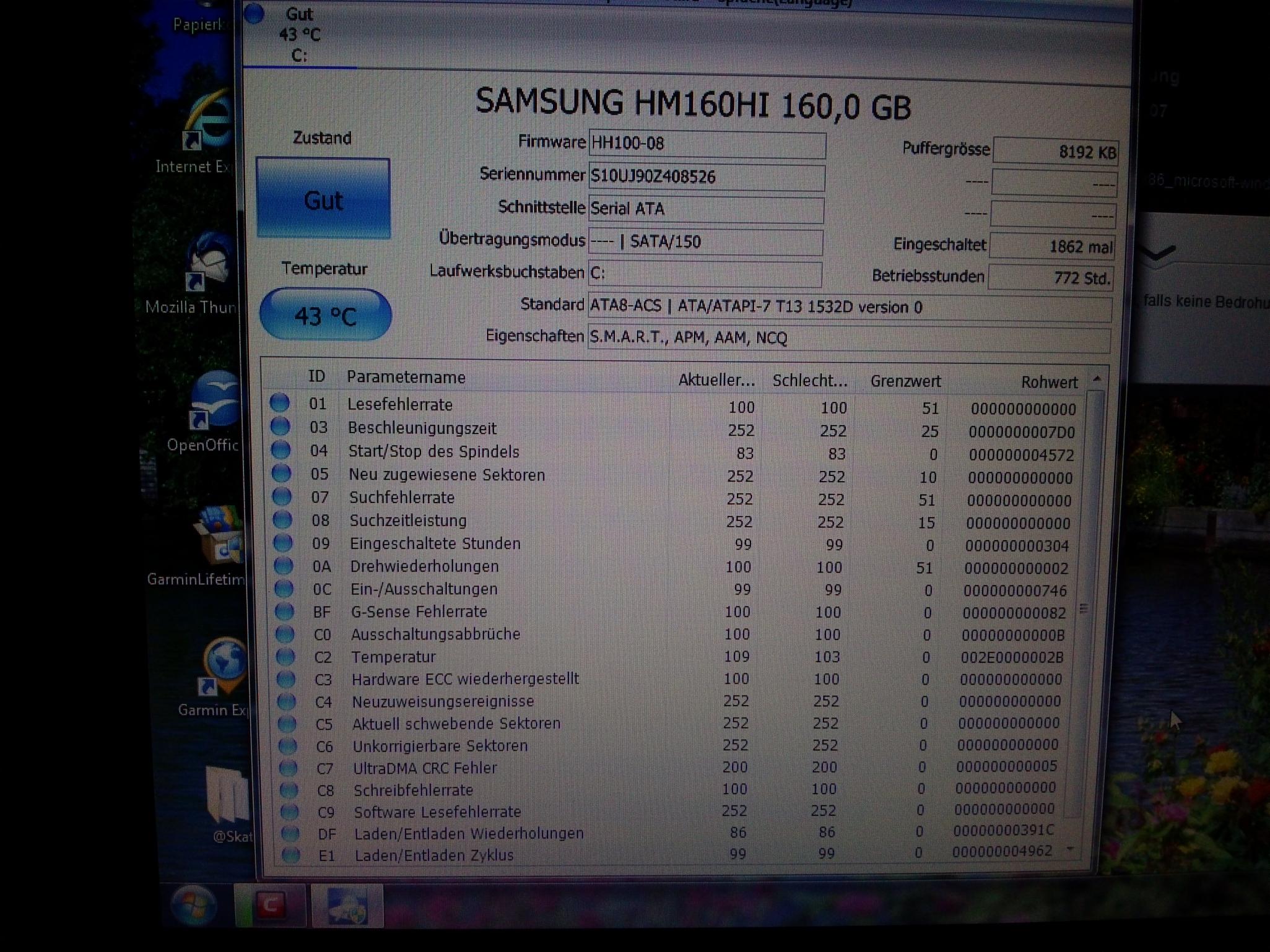 Die Festplatte ich soweit hin Ordnung, nur ein paar Ultra-DMA CRC Fehler könnten auf ein Problem mit den SATA Kabel (haben ja einige Notebooks) oder den Kontakten hinweisen. Wenn der Rohwert von C7 steigt, dann würde ich mal prüfen, ob die Platte gut aufgesteckt ist. Ansonsten würde ich die auch mal defragmentieren, das kann auch schon helfen. Ob es sich lohnt da noch etwas aufzurüsten und welche aktuellen SSD mit dem alten Controller überhaupt problemlos laufen? Die ersten SATA Host Controller hatten teilsweise schon Probleme mit den ersten SATA II Platten, weshalb diese Platten ja auch einen Jumper zum Erzwingen des SATA I Modus hatten.