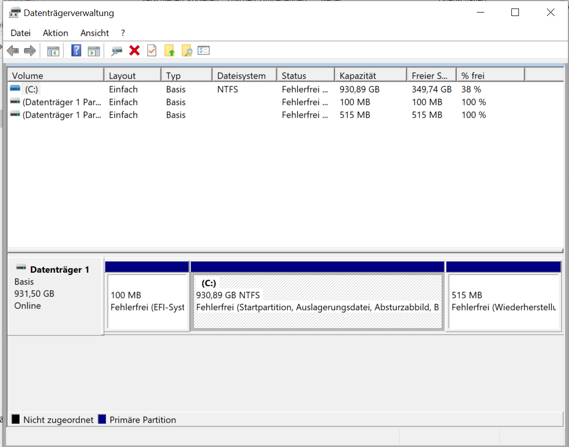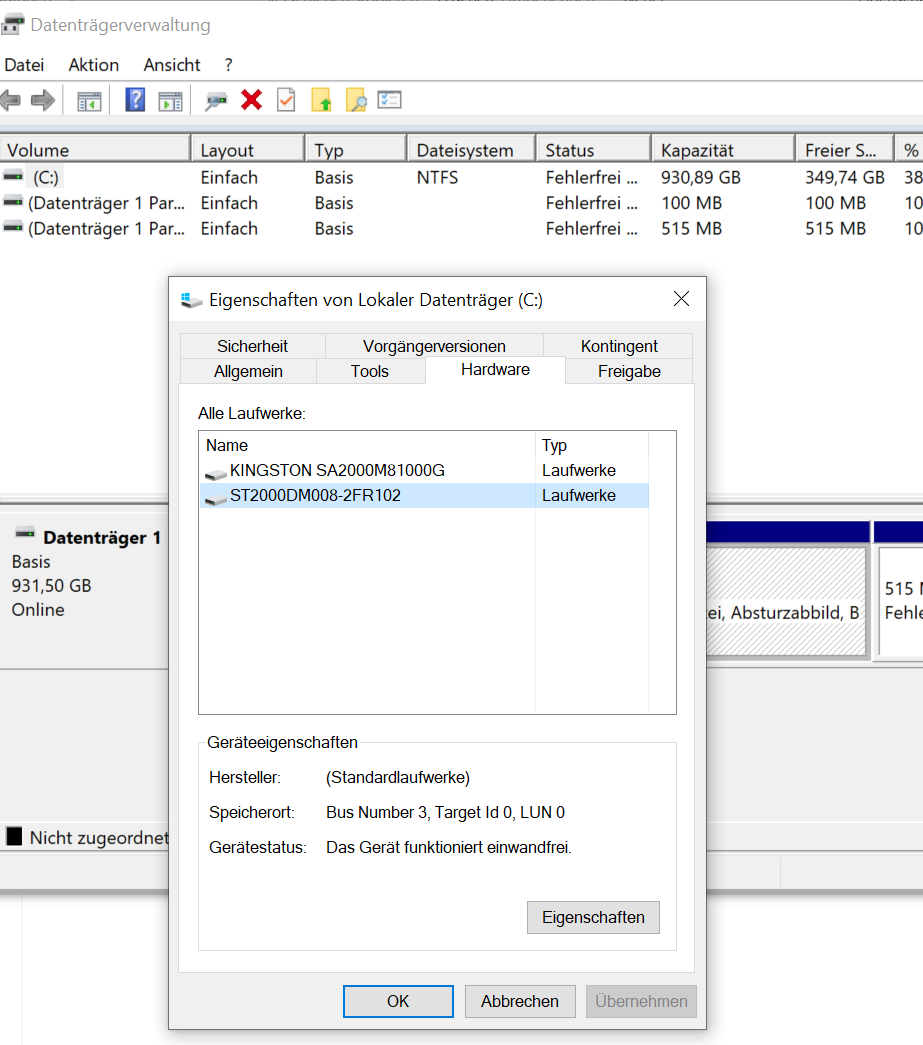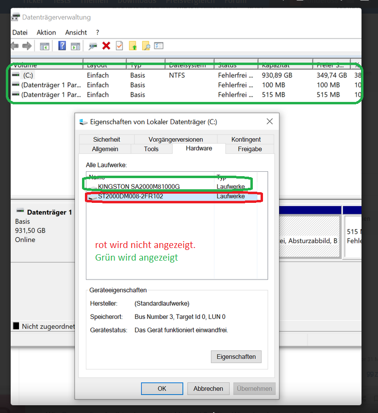 relativer neu selbst gebastelte Rechner. Problem ist das HDD Laufwerk wird zwar im Gerätemanager erkannt aber nicht in der Datenträgerverwaltung. Dort wird nur C: angezeigt. Unter Eigenschaften - > Hardware werden beide Laufwerke HDD und SSD angezeigt aber nur der Speicherplatz der SSD angezeigt. Beim Anzeigen des Volumens der HDD bekomme ich eine Fehlermeldung. Volumen kann nicht errechnet werden. Möchte aber die HDD als D: Laufwerk anlegen. Wie "trenne" ich die beiden das ssd c: ist und HDD D: Laufwerk?