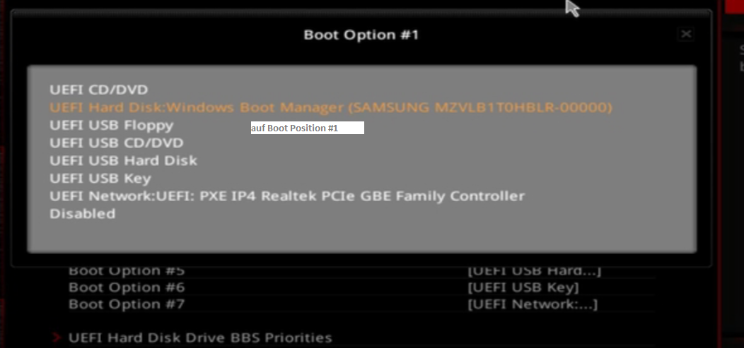 Ich habe gesehen, dass in den Boot Order priorities der Name des Windows Speichers noch mit dran steht… also uefi hard disk und dann noch der Name des Speichers hinten dran. Bei mir aber nicht.