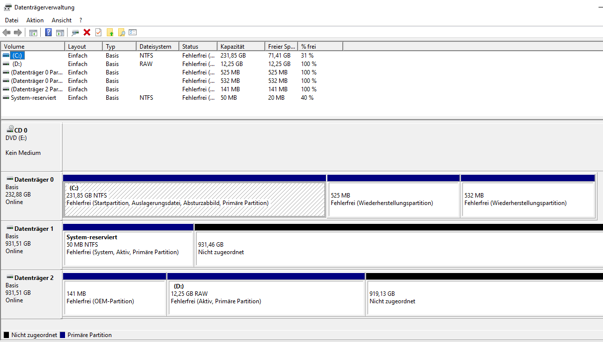 1. Beide HDDs werden nicht mehr korrekt erkannt. Siehe Screenshot. Windows erkennt auf einer der Festplatten eine 12GB RAW(?) Partition aber der Rest ist nicht allokiert. Vor dem Hardwarewechsel und Neuinstallion waren beide HDDs ganz normal zugreifbar.