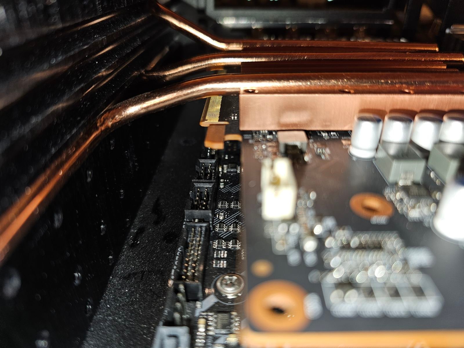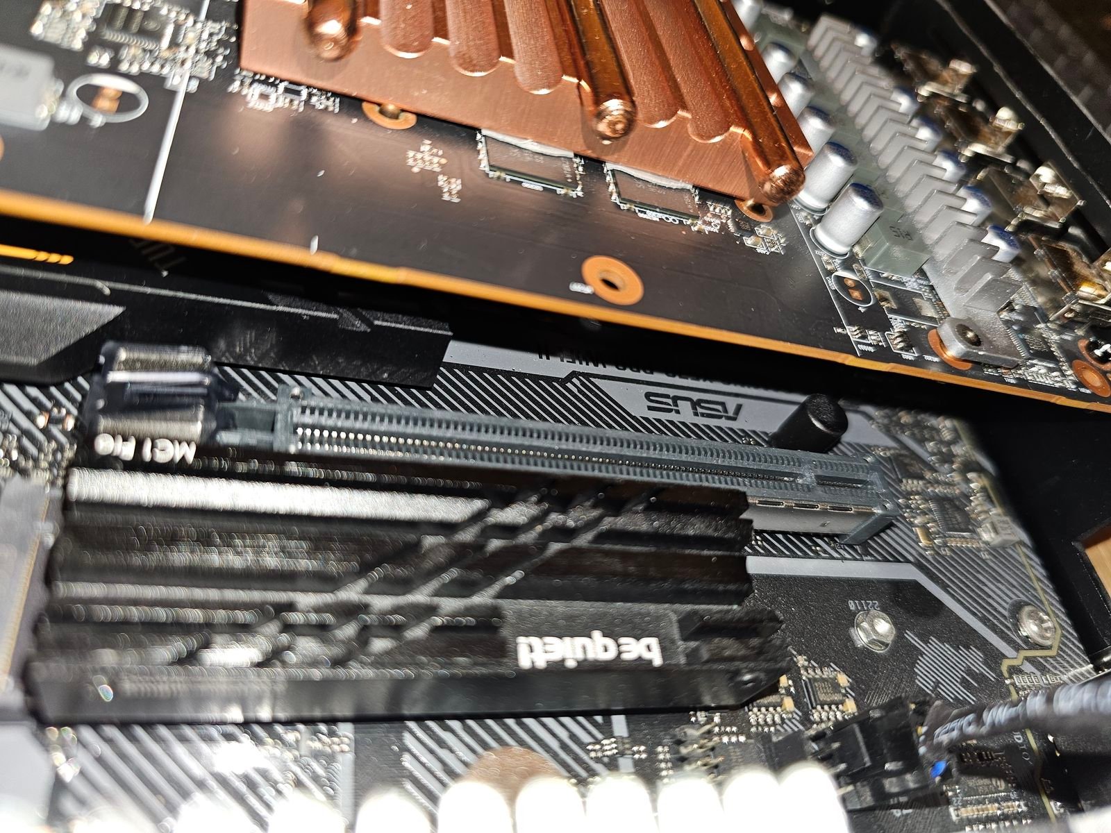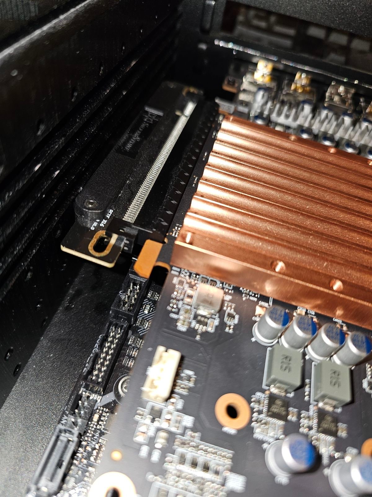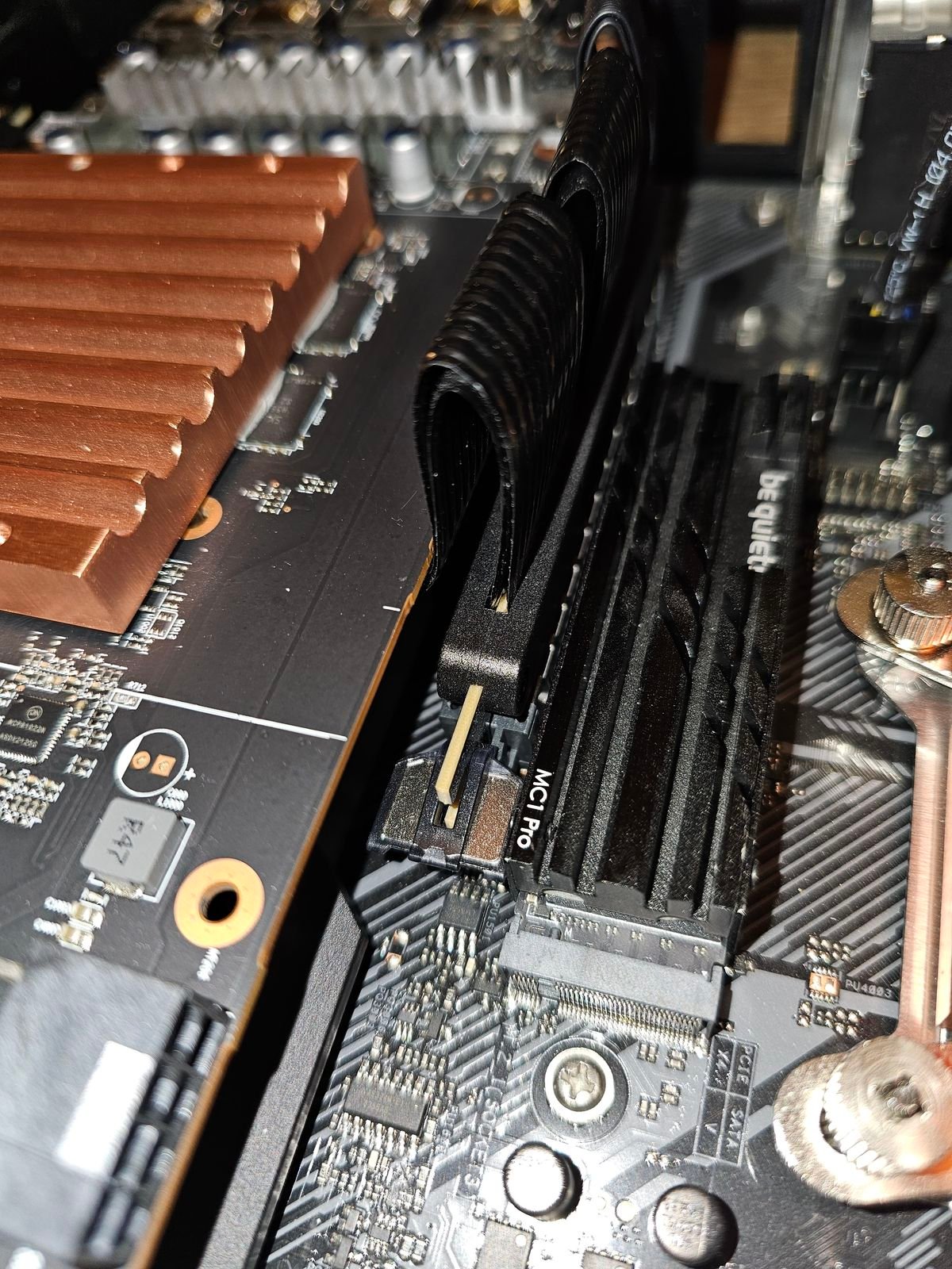 Bilder 4-6 zeigen einen PCIe 4.0 Riser von Silverstone. Der funktioniert auch, allerdings gefällt mir nicht, dass das Kabel so stark geknickt werden muss. Außerdem lässt er zu wenig Platz zur Gehäusewand, dort muss nämlich noch eine Platte installiert werden, um die Kupferrohre festzuhalten (Bild 7).