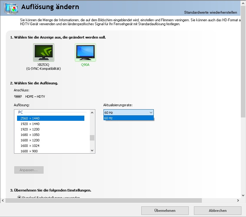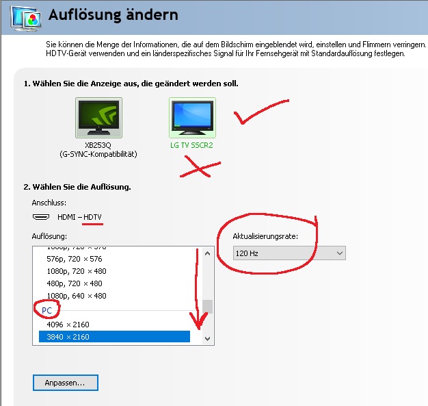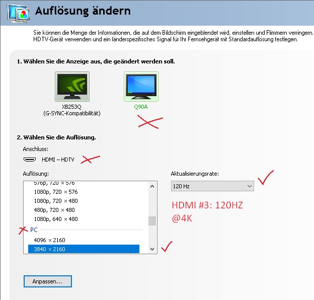 Problem: An dem QLED HDMI 2.1 Port #4 bekomme ich nur 60Hz in der nativen 4K Auflösung. Die 4K Auflösung wird auch gar nicht erst angezeigt zur Auswahl unter dem "PC Reiter". Die ist schlicht weg.
