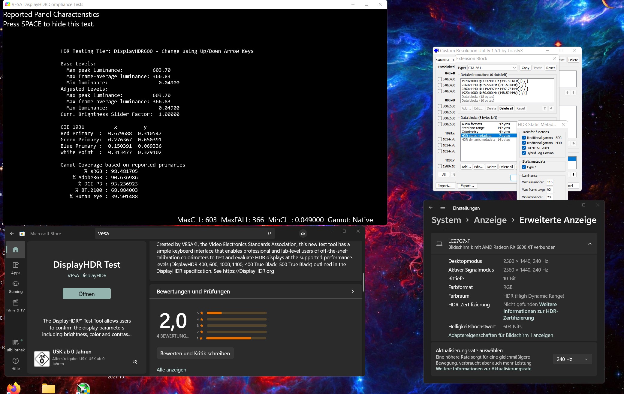 Wenn ich CRU nutze und HDR aktivieren möchte, muss ich die Hz-Zahl unter Windows auf 60 reduzieren und alles funktioniert wunderbar, ausser dass ich überall nur noch 60 Hz habe, auch wenn es nichts in HDR zu sehen gibt.