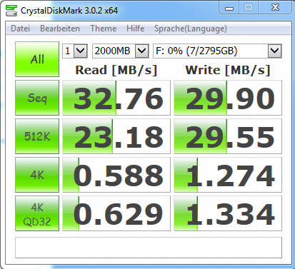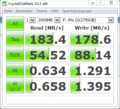 Habe die Platte mit GPT als NTFS Partition mit 4k Bytes Zuordnungseinheit formatiert. Partion Wizard hat auch keinen Fehler gemeldet. Auch Windoof hat die Festplatte dann auf Anhieb erkannt und volle 2,72TB angezeigt. Hab dann die USB 3.0 Treiber für mein Asus Board installiert und mal CrystalDiskMark drüber laufen lassen: