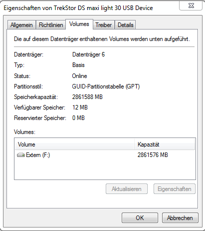 Nebenbei, taucht der Partitionsname unter Windows nicht auf und die Platte wird einfach als Lokaler Datenträger aufgelistet und die Datenträger Eigenschaften erkennen nur 12MB Verfügbaren Speicher O.o