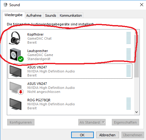 habe mir ein neues Headset (SteelSeries Arctis Pro + GameDAC) gekauft. Auf meinem einen Pc (Win 8.1) funktioniert dieses auch einwandfrei. Unter Win 10 Pro auf meinem eigentlichen Computer allerdings nicht so ganz. Man kann am GameDAC des Headsets den Sound vom Spiel und vom Chat (Discord, TS, ...) einzeln lauter/leiser stellen. Bei Windows 8.1 funktioniert das auch, bei Windows 10 Pro allerdings nicht. Wenn ich bei Win 10 auf Wiedergabegeräte gehe habe ich nicht wie bei Win8.1 das "Arctis Pro + GameDAC", sondern "GameDAC (Game)" und "GameDAC (Chat)", somit kann ich immer nur einen der beiden Sounds hören. Hat jemand eine Idee wie ich das ändern kann?