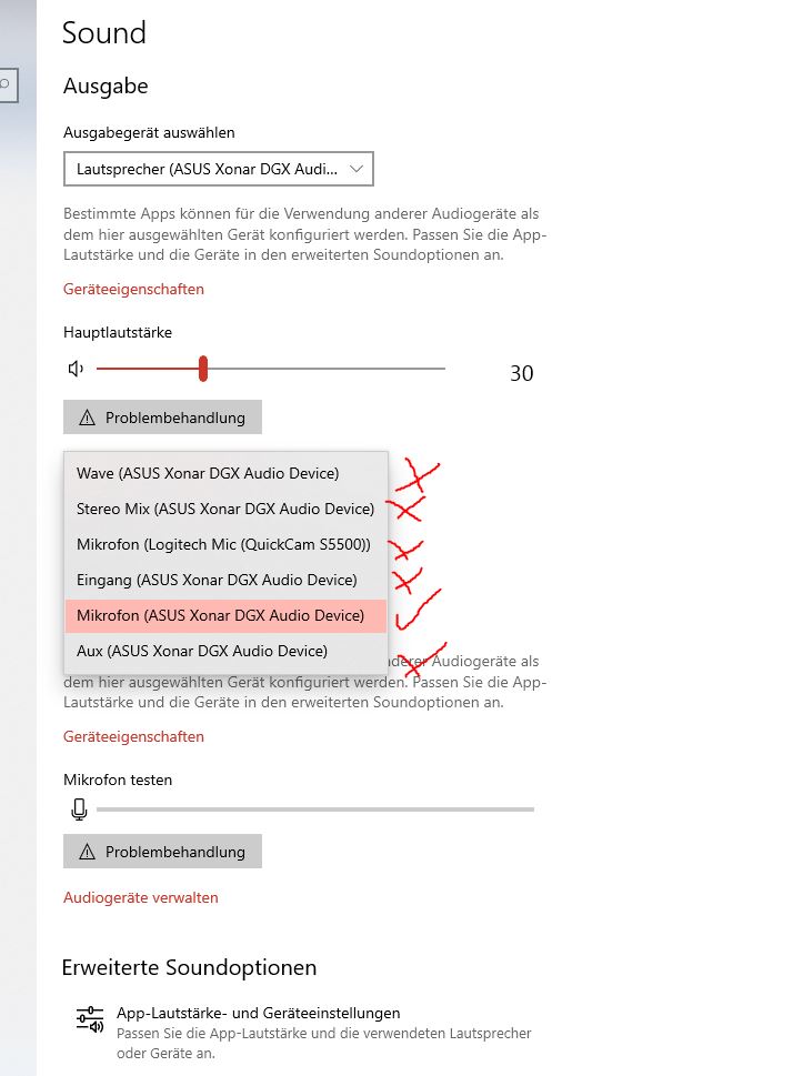 Hier ein Beispiel. Im Win. habe ich das Mic. der Soundkarte aktiv. Sonst würde Skype, TS3 etc. das Webcam Mic. nehmen etc.